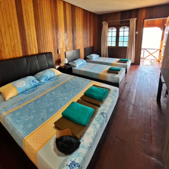 Enjoy stunning sea views in our Triple Sharing Room featuring two queen beds in one room and one queen plus one single bed in another. Facilities include attached bathrooms, air conditioning, fan, and kettle. Choose from 5 Days 4 Nights Meal Plan or Adventure Package, starting at RM190 per night.